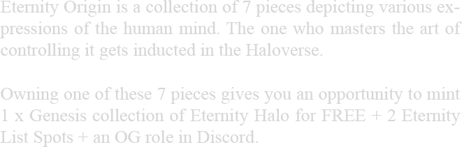 A: Eternity Origin is a collection of 7 NFTs which will act as a direct opportunity to mint an Eternity Halo. Owning an Eternity Origin will allow you two Eternity List spots, one free mint and an OG role in the Discord community.